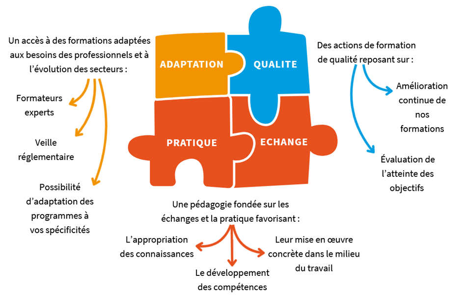 • L’adaptation aux évolutions des secteurs et aux besoins des stagiaires : Nous adaptons nos programmes aux évolutions des secteurs, aux exigences réglementaires et aux besoins exprimés par les stagiaires. Nos formations sont animées en tenant compte des pratiques actuelles et des réalités de terrain.
